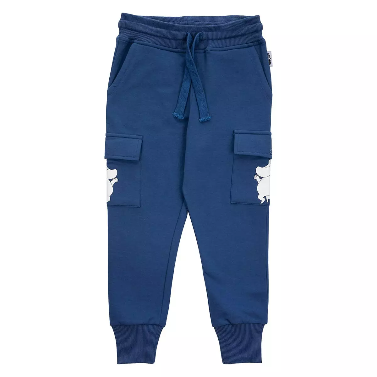 Siniset Muumi collegehousut, joissa sivuissa päälleommellut paikkataskut iloisen Muumipeikon kuvilla.