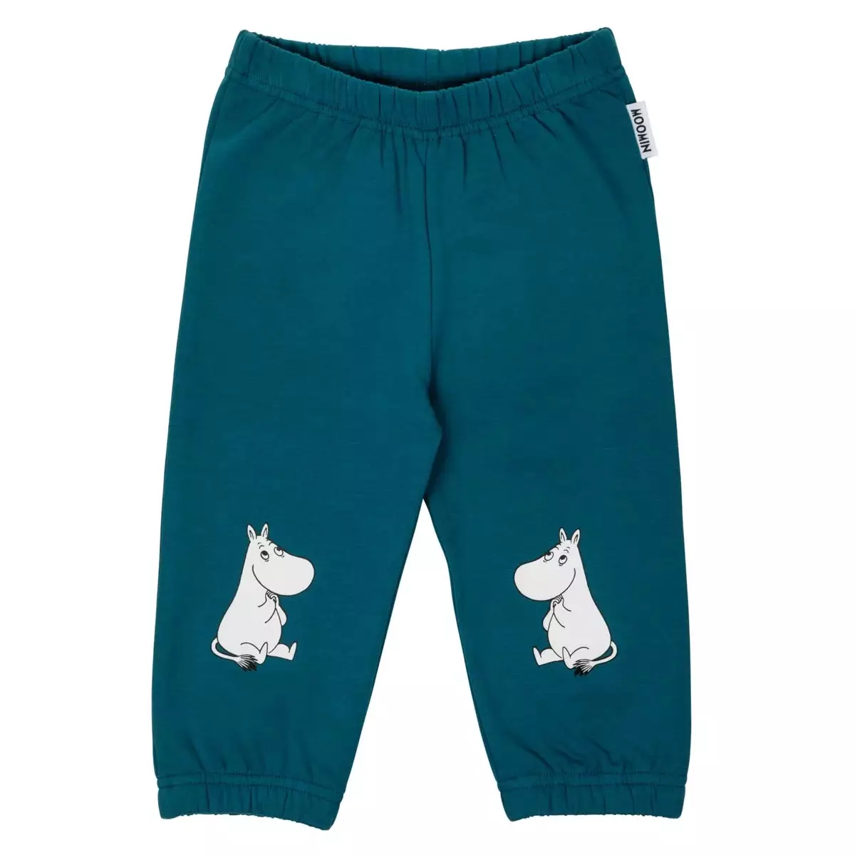 Martinex Muumipeikko housut sininen, ovat pehmoiset collegehousut mukavan joustavalla vyötäröllä. Housujen polvissa haaveilevan Muumipeikon kuva.