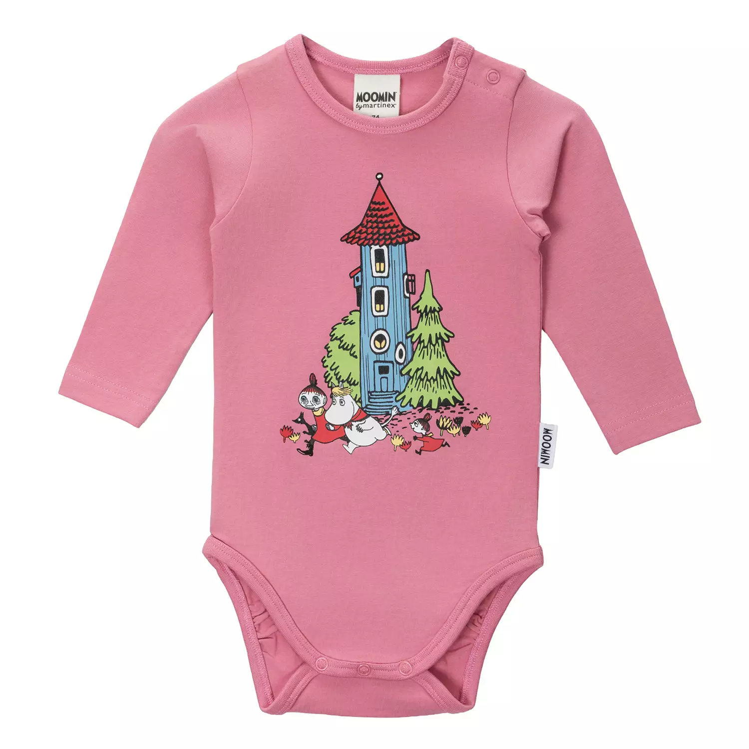 Martinex Muumitalo Body Roosa on pehmeää luomupuuvillaa, joka tuntuu mukavalta vauvan päällä. Roosassa bodyssa on kuva Muumitalosta ja Muumilaakson asukkaista.