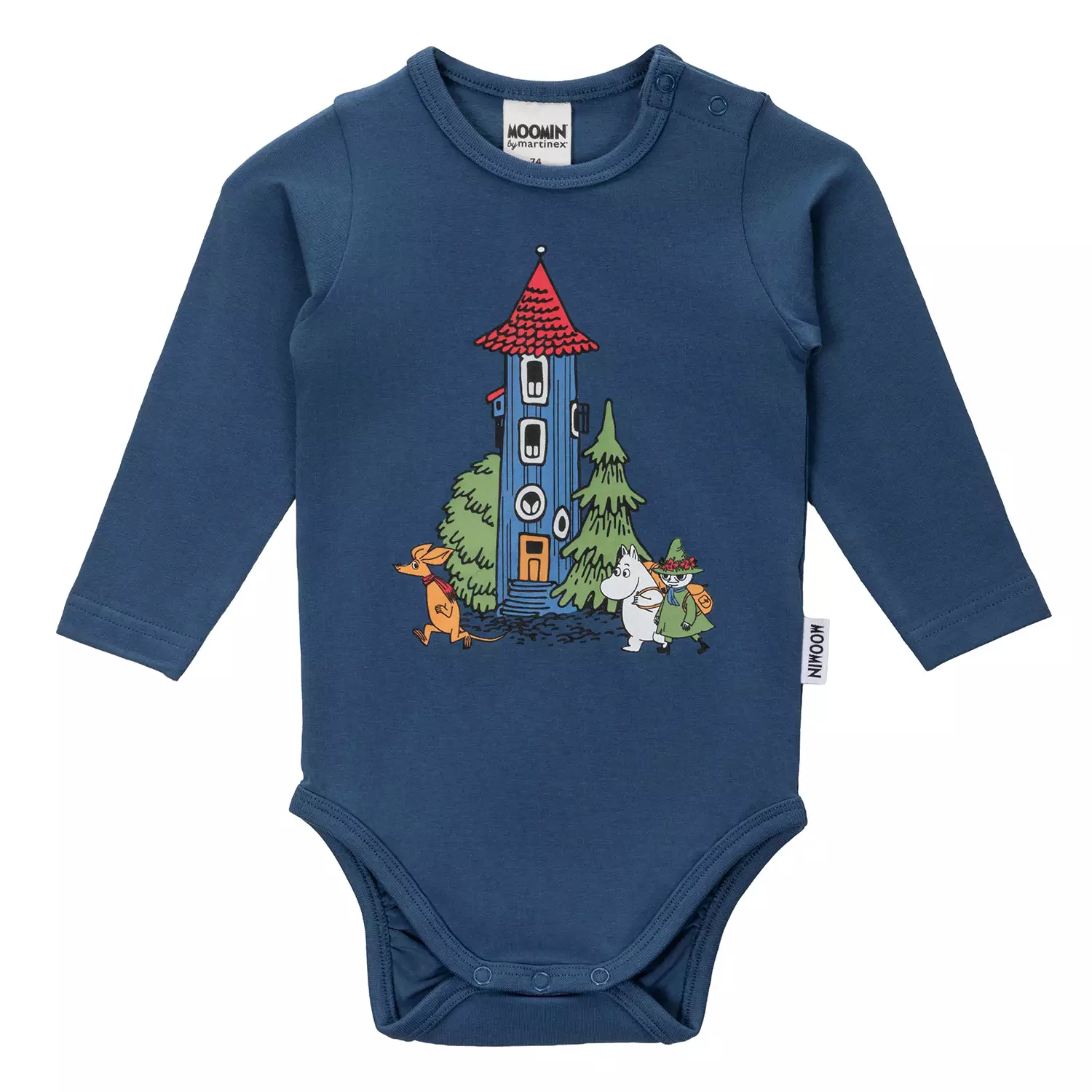 Martinex Muumitalo Body Tummansininen on pehmeää luomupuuvillaa, joka tuntuu mukavalta vauvan päällä. Tummansinisessä bodyssa on kuva Muumitalosta ja Muumilaakson asukkaista.