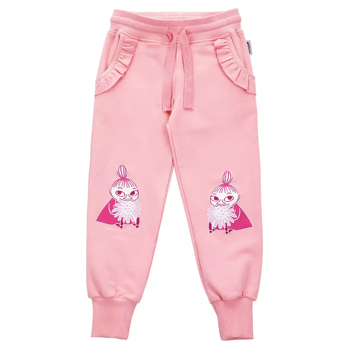 Vaaleanpunaiset Myy collegehousut, joissa polvissa hauskat kuvat Pikku Myystä ja taskuissa frilla koristukset.