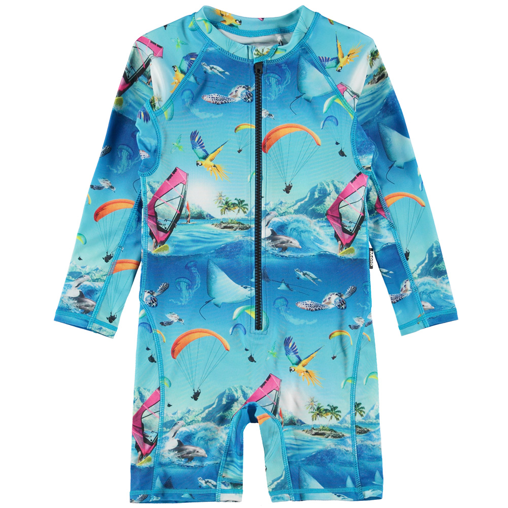 Molo Neka uimapuku Passion For Motion 2023 suojaa tehokkaasti lasta auringolta rannalla, kesän pihaleikeissä, mökillä ja aurinkolomalla. Pitkät hihat ja lyhyet lahkeet.