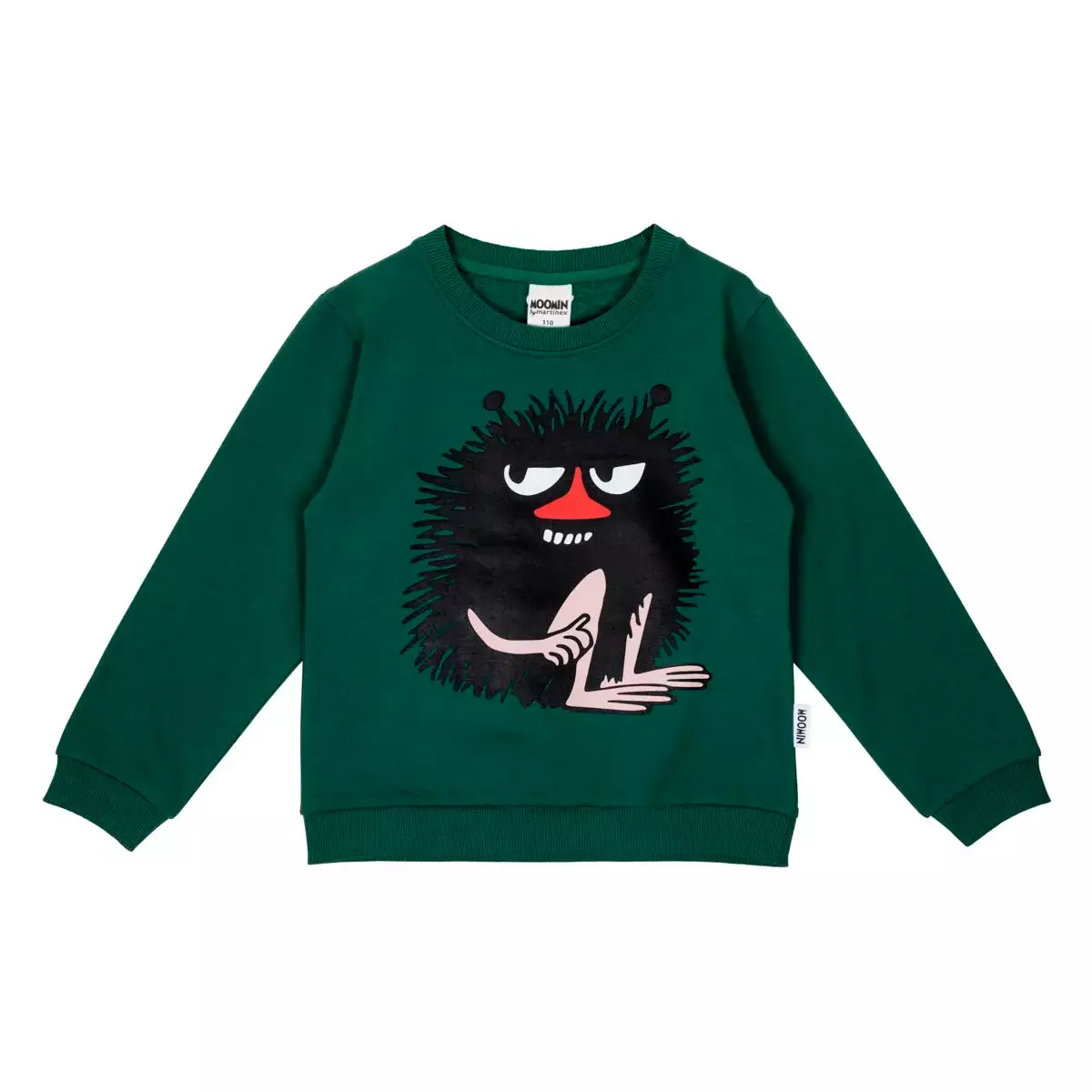 Muumi Haisuli Collegepaita Vihreä, on pitkähihainen mukava paita, jossa on keppostelevan Haisulin kuva.