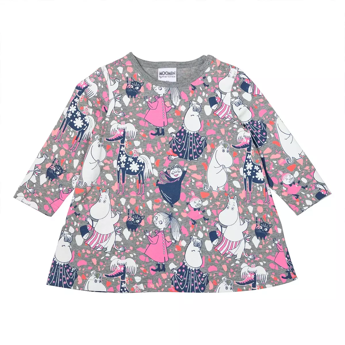 Harmaa A-linjainen Muumi-mekko, jonka olkapäillä on painonapit. Mekko on valmistettu luomupuuvillatrikoosta. Öko-tex-sertifioitua materiaalia.