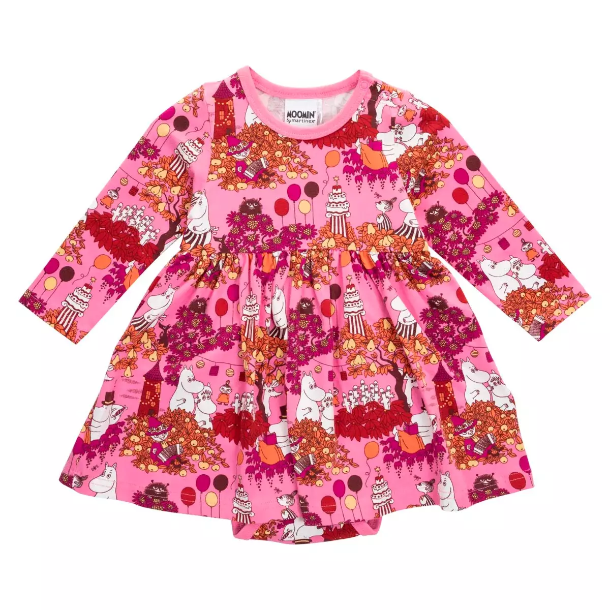 Martinex Muumi Juhlahetki bodymekko Vaaleanpunainen on joustavaa luomupuuvillaa. Värikäs bodymekko, jossa Muumilaakson asukkaat viettävät puutarhajuhlia.