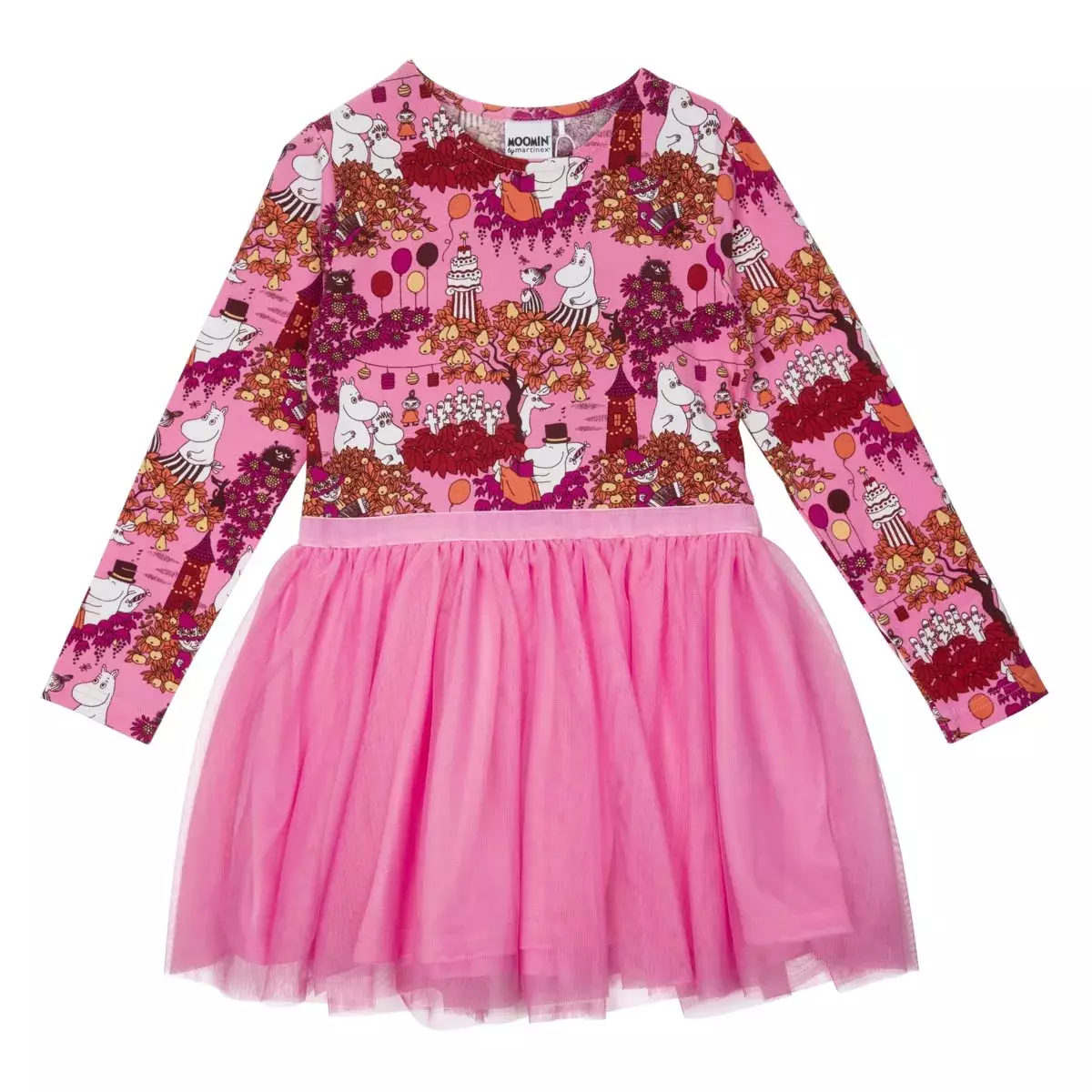Muumi Juhlahetki Tyllimekko vaaleanpunainen, on ihastuttava mekko pitkillä hihoilla, jossa samettinauha sekä pehmeästi laskeutuva tyllihelma. Yläosassa on ihastuttava Juhlahetki-kuosi, jossa Muumilaakson asukkaat juhlivat yhdessä puutarhassa.