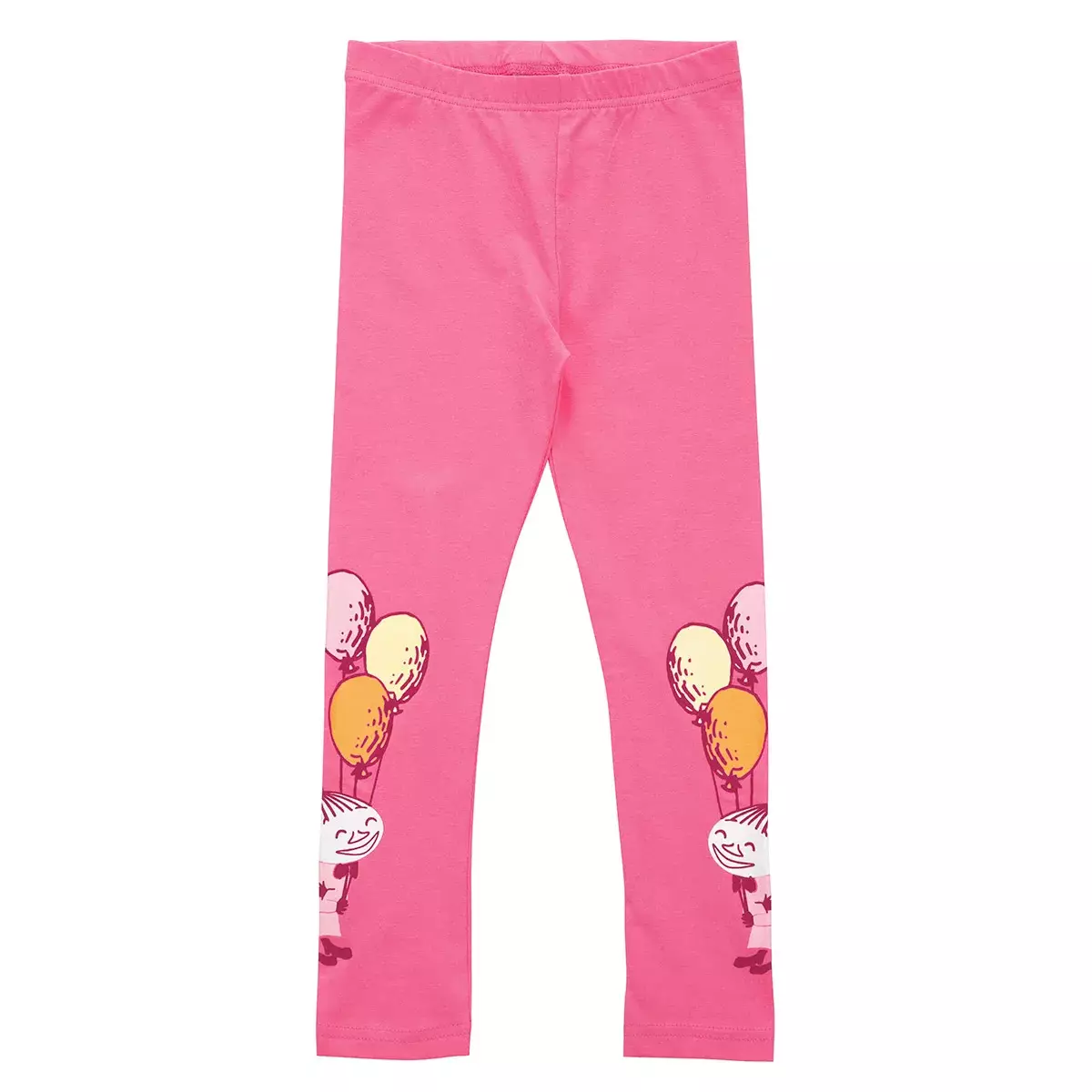 Muumi Juhlia Legginsit pinkki, ovat ihanan pehmeää ja joustavaa luomupuuvillatrikoota. Liilat legginsit, joiden lahkeissa on iloiset kuvat Pikku Myystä ilmapallojen kera.- Pitkät lahkeet