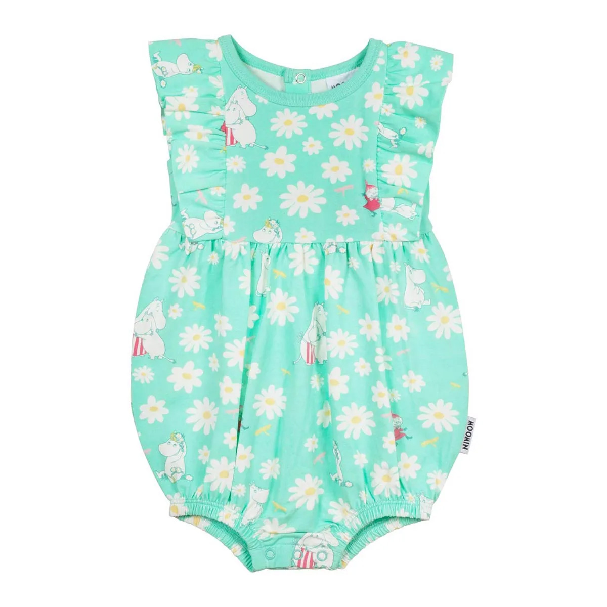 Muumi Luonnonkukka Leikkipuku Minttu on pehmeää luomupuuvillaa. Hihattomassa leikkipuvussa on pisaramainen malli, empire-leikkaus sekä yläosassa röyhelöt. Hellepuvussa on mintunvihreä pohja, jossa kauniita päivänkakkaroita sekä Muumimamma, Niiskuneiti ja Pikku Myy.