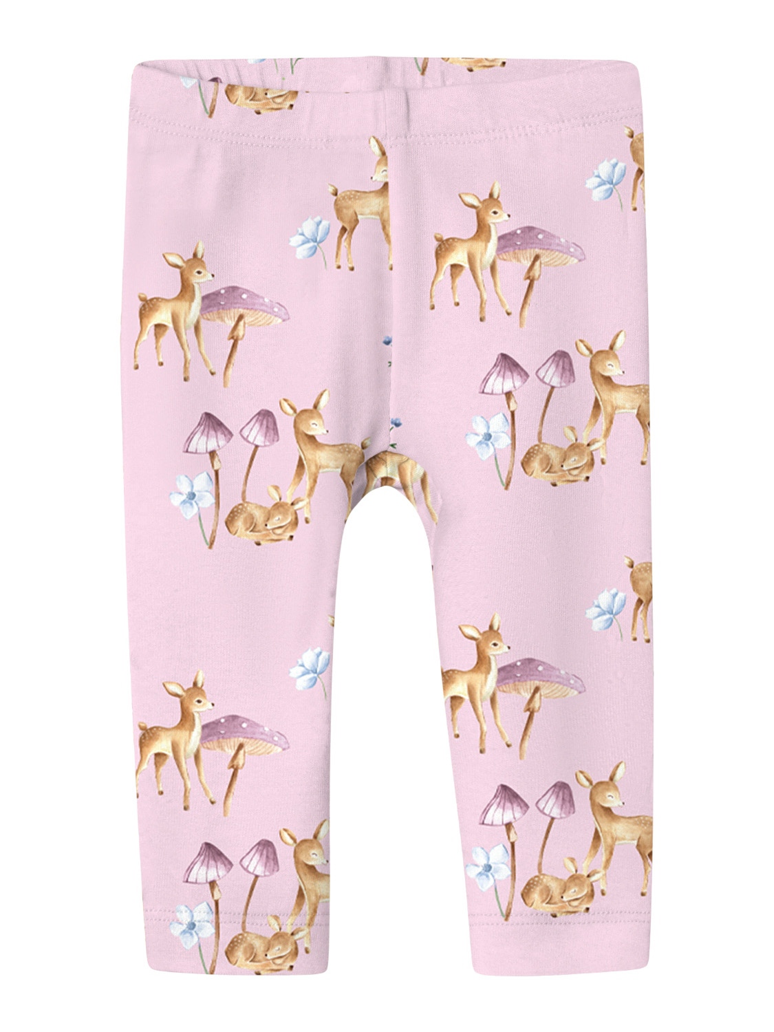 Vaaleanpunaiset Name It legginsit vauvalle bambin kuvilla. Valmistettu pehmoisesta luomupuuvillasta.