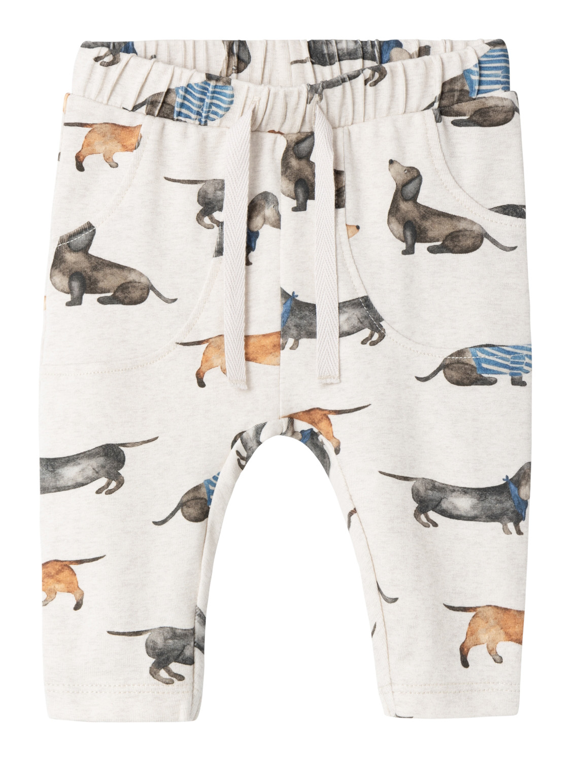 Name It housut Peyote Melange vauvalle suloisilla koiran kuvilla. Pehmeissä housuissa on säädettävä joustava kuminauhavyötärö, kiristysnyörit sekä taskut edessä.