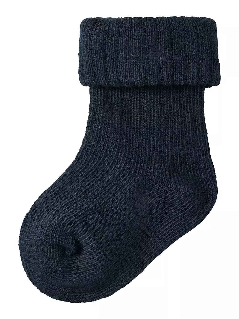 Name It sukka Navy Blazer värissä, ovat pehmeät kauniit ribbineulos-sukat lapselle. Ribbineuloksessa on pystysuora raitakuvio. Sukat ovat joustavat ja mukavan pehmeät. Yksiväriset sukat on helppo yhdistellä eri vaatteiden kanssa. Sukissa on käännettävä resori.