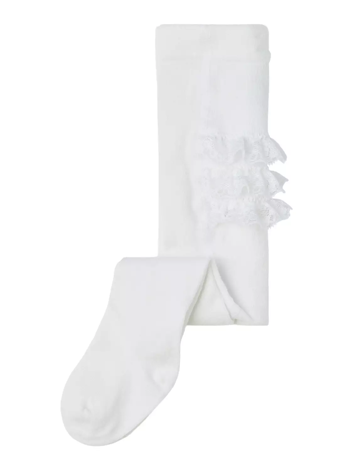 Name it sukkahousut Bright White vauvalle, jossa suloisena yksityiskohtana pepussa röyhelöt. Sukkahousut on valmistettu pehmoisesta puuvillasta. Sopii niin arkeen kuin juhlaan!