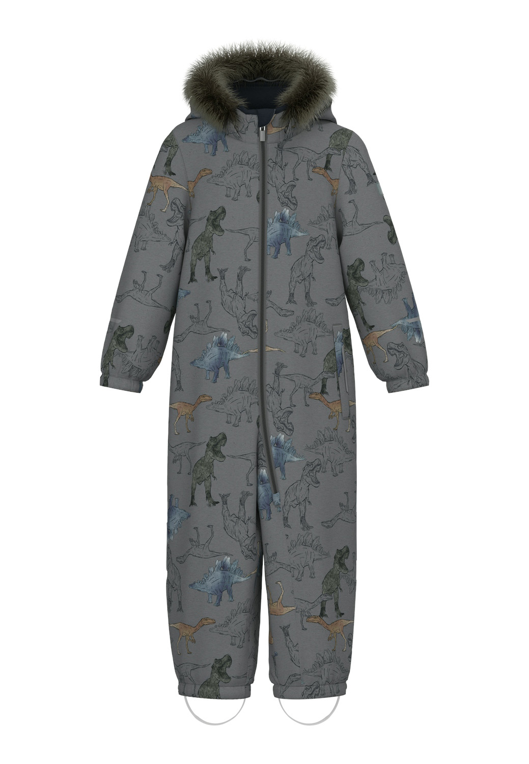 Name It talvihaalari Mockingbird Dino pitää lapsen lämpimänä talven leikeissä. Toppahaalarin tummanharmaalla pohjalla on upea dinosaurus-kuosi ja hupussa muhkea turkisreunus.
