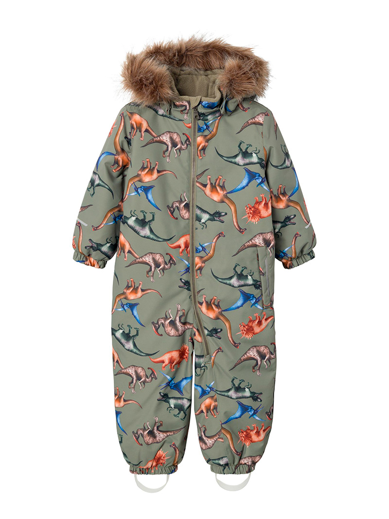 Name It talvihaalari Vetiver pitää lapsen lämpimänä talven leikeissä. Vihreä toppahaalari dinosaurus-kuosilla ja muhkealla turkisreunuksella.