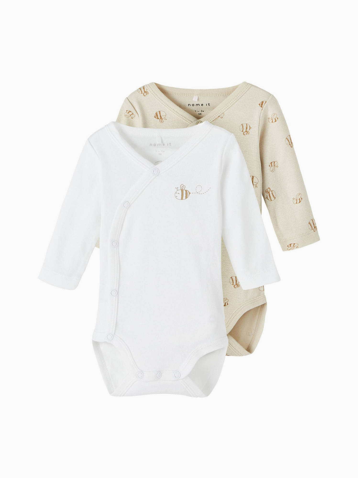 Name It vauvan body 2-pack Rainy Day värissä. Name it body on erittäin pehmoinen ja mukava vauvan päällä. Body on kietaisumallinen, joten se on helppo pukea pienen vauvan päälle. Pakkauksessa kaksi kietaisubodya: valkoinen ja beige, joissa mehiläisen kuvia.