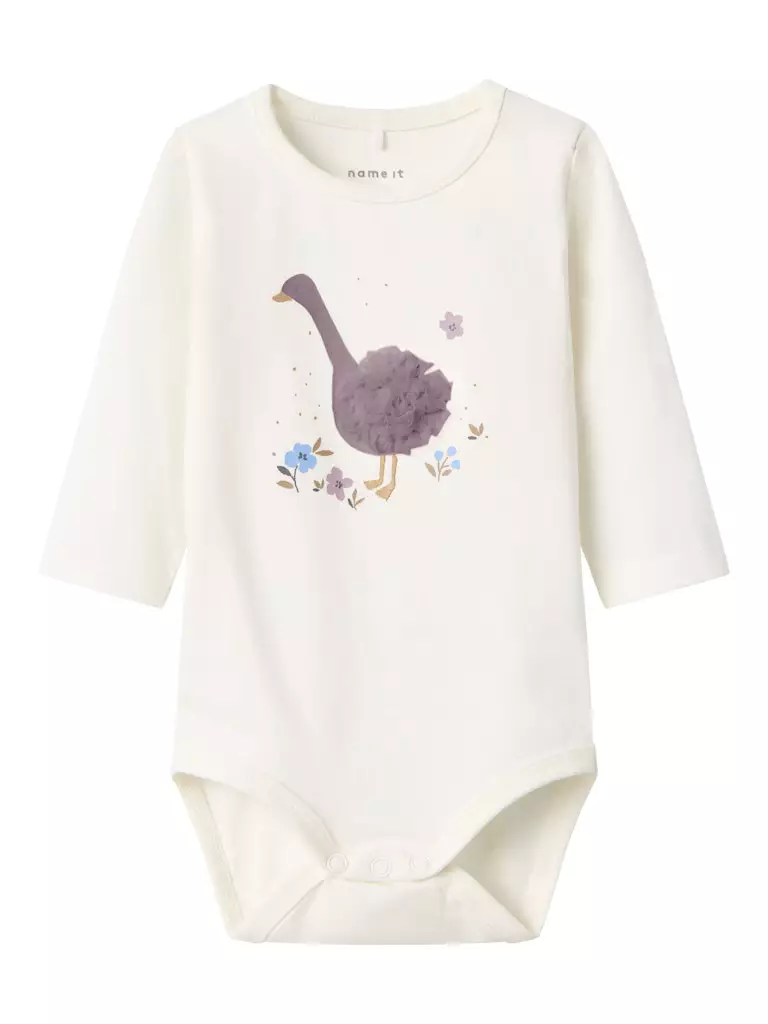 Valkoinen Name It pitkähihainen body vauvalle suloisella 3D lintu-kuvalla.