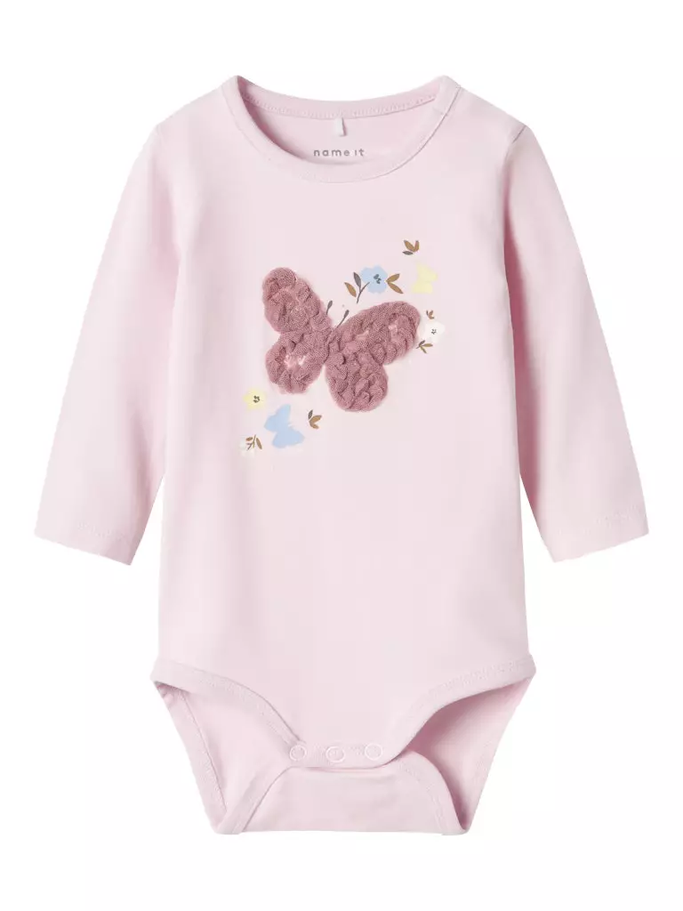 Liila Name It pitkähihainen body vauvalle suloisella 3D perhos-kuvalla.