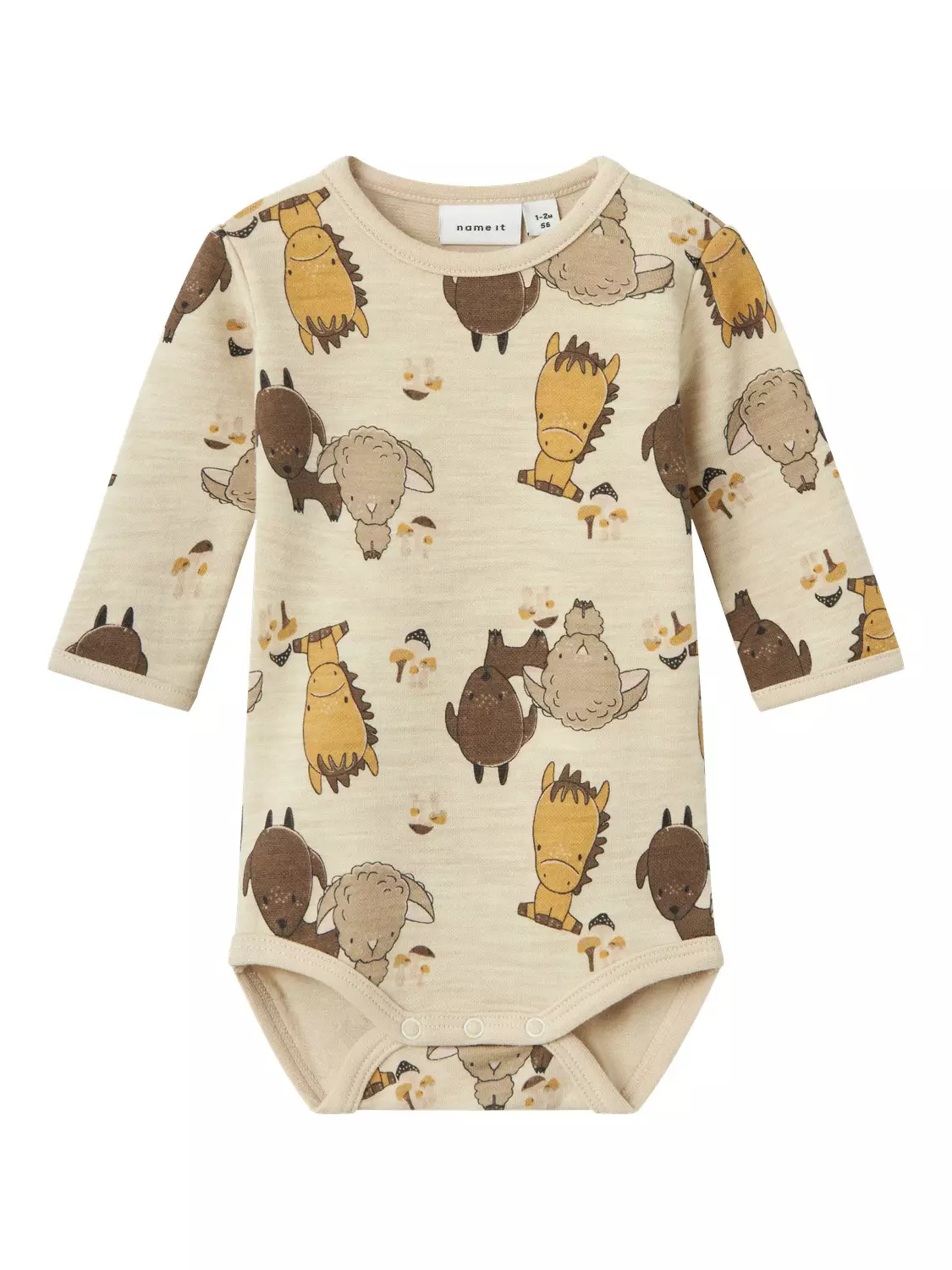 Name It merinovillainen body vauvalle suloisilla eläinten kuvilla.