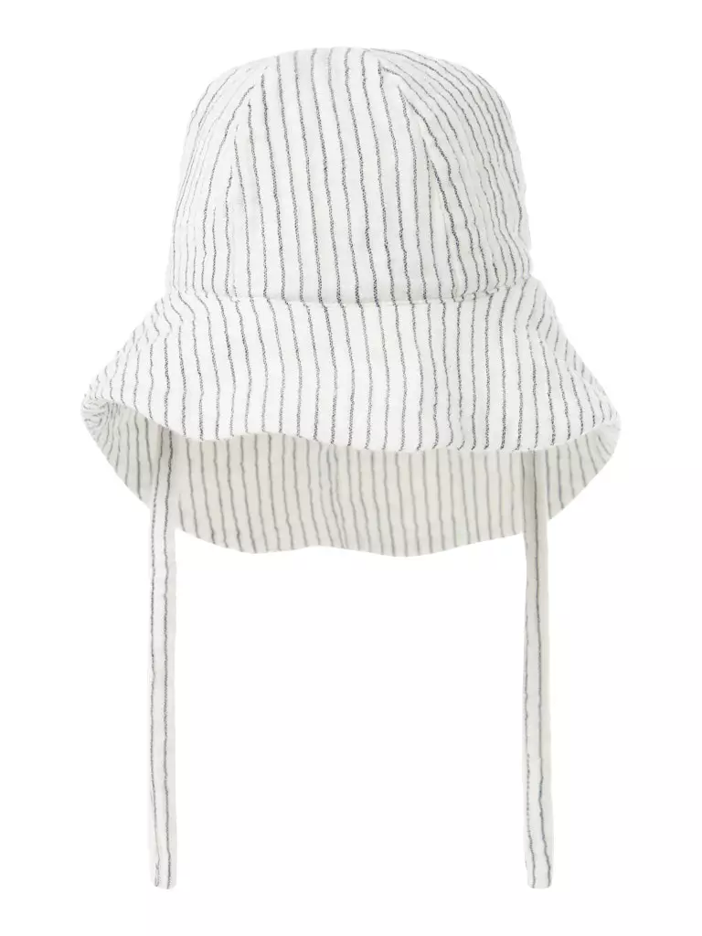 Name It vauvan hattu Navy Blazer - Cloud dancer on nauhallinen hellehattu, jossa on leveä lieri. Lieri suojaa kasvoja ja niskaa auringolta, leuan alle solmittavat nauhat pitävät hatun päässä. Hempeä raidallinen hattu on ihana hellehattu kesään.