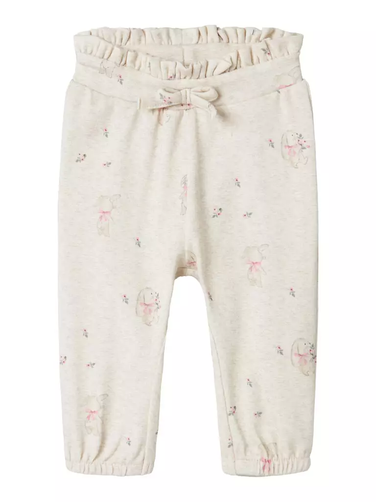 Name It vauvan housut Peyote Melange on vaaleat pehmoiset housut vauvalle, joissa pieniä kukkia ja pupujen kuvia. Housuissa on säädettävä joustava kuminauhavyötärö.