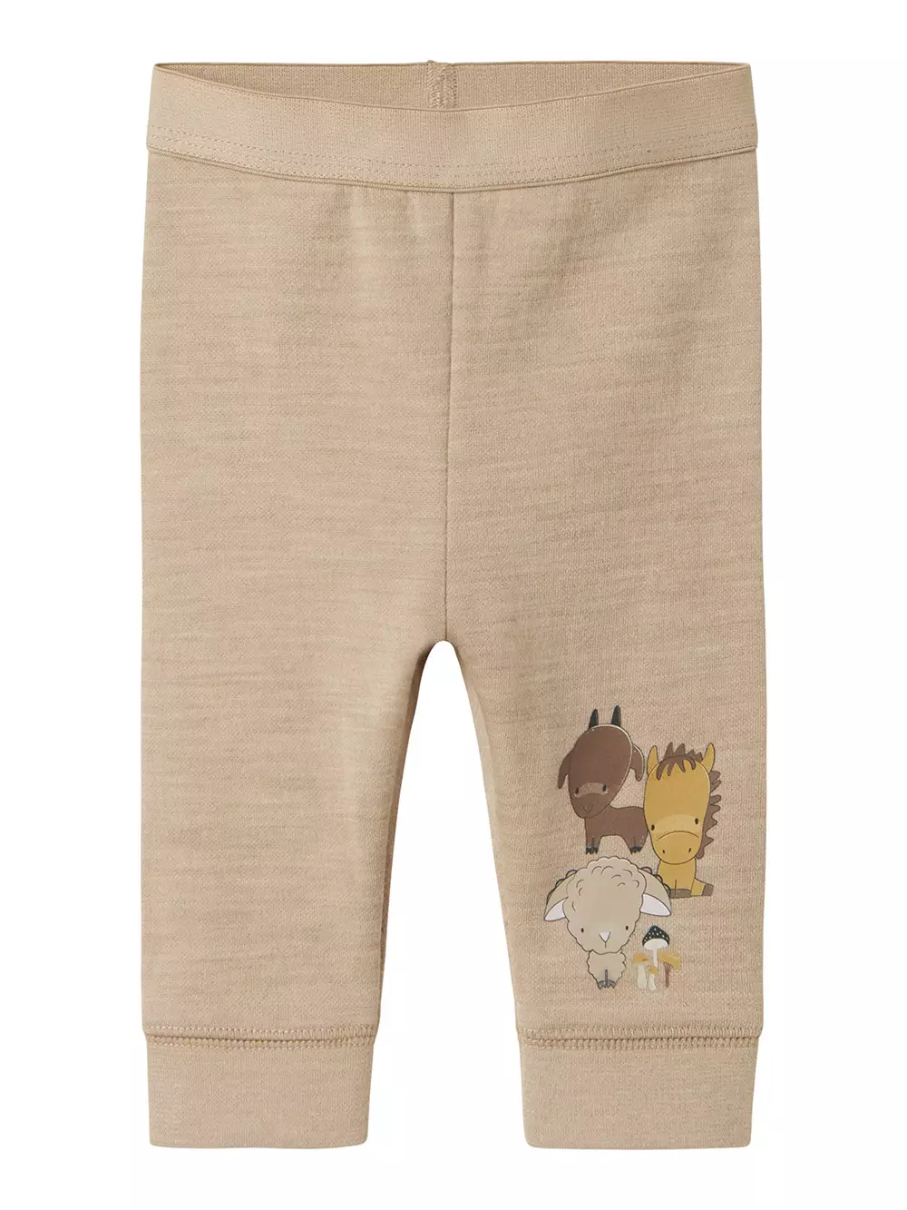 Suloiset Name It vauvan housut, joissa materiaalina pehmeää merinovillaa. Toisessa lahkeessa eläinkuva.