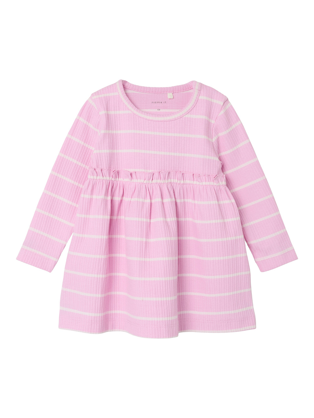 Name It vauvan mekko Pastel Lavender on pehmoinen raidallinen ribbineulosmekko vauvalle. Ajaton mekko on helppo yhdistellä muiden vaatteiden ja asusteiden kanssa.