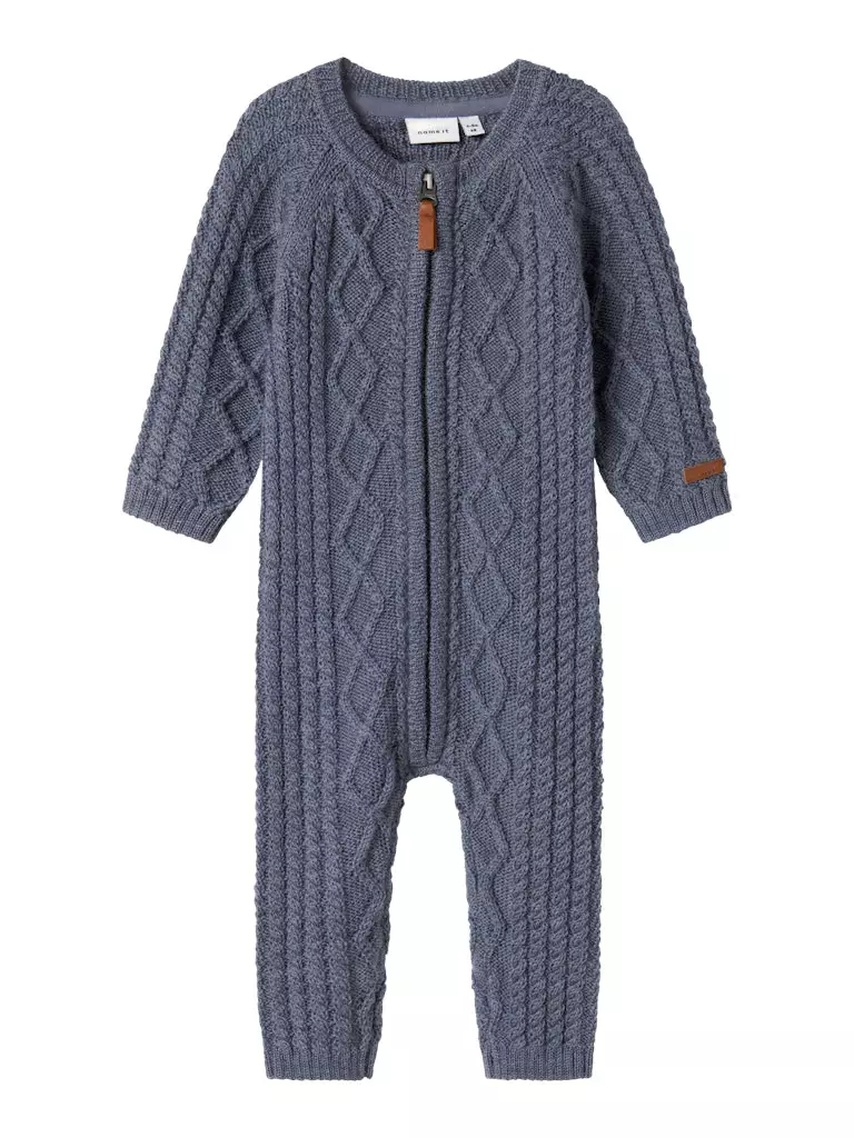 Villahaalarissa on kaunis palmikkoneulekuvio. Pitkä vetoketju tekee haalariin sujahtamisen helpoksi. Resorit lahkeissa ja hihansuissa.