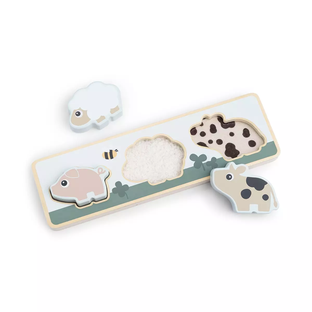 Sensorinen palapeli sisältää eri tekstuureja ja kuvioita sekä värikkäitä kontrasteja. Isoihin paloihin on helppo tarttua pienillä sormilla ja se kehittää hienomotorisia taitoja. Palojen yhdistäminen oikean taustan kanssa kehittää loogista ajattelua ja ongelmanratkaisukykyä.