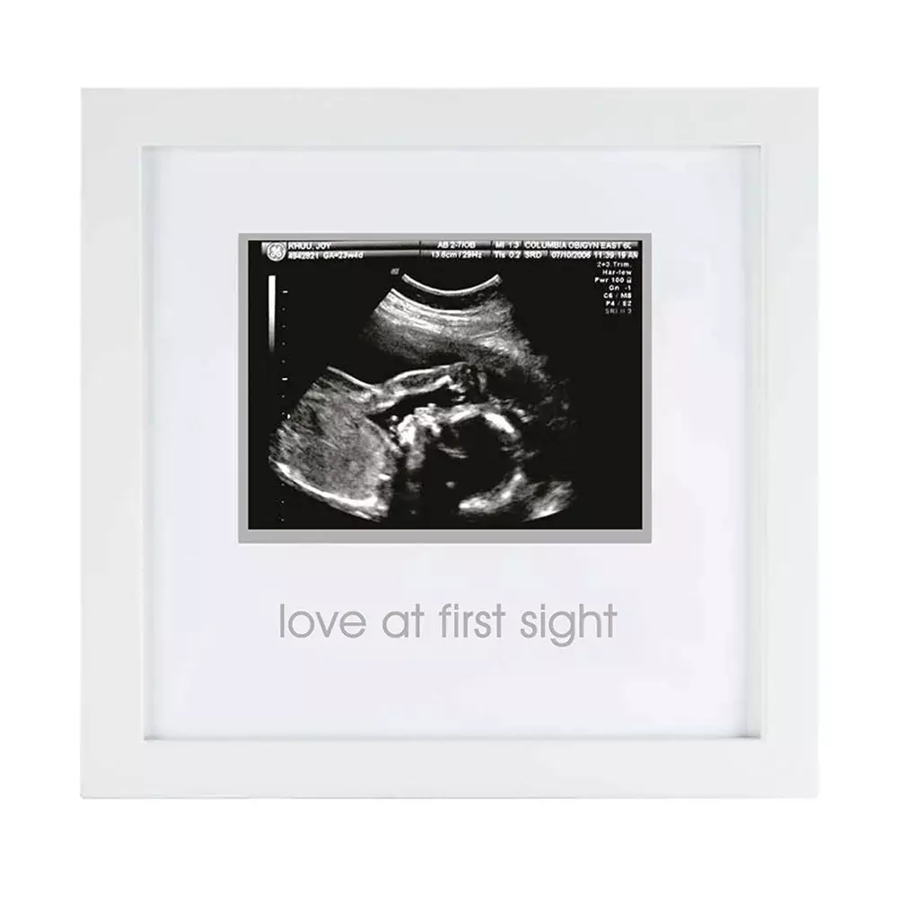 Kaunis valkoinen puukehys ultraäänikuvalle. Alareunassa teksti: love at first sight.