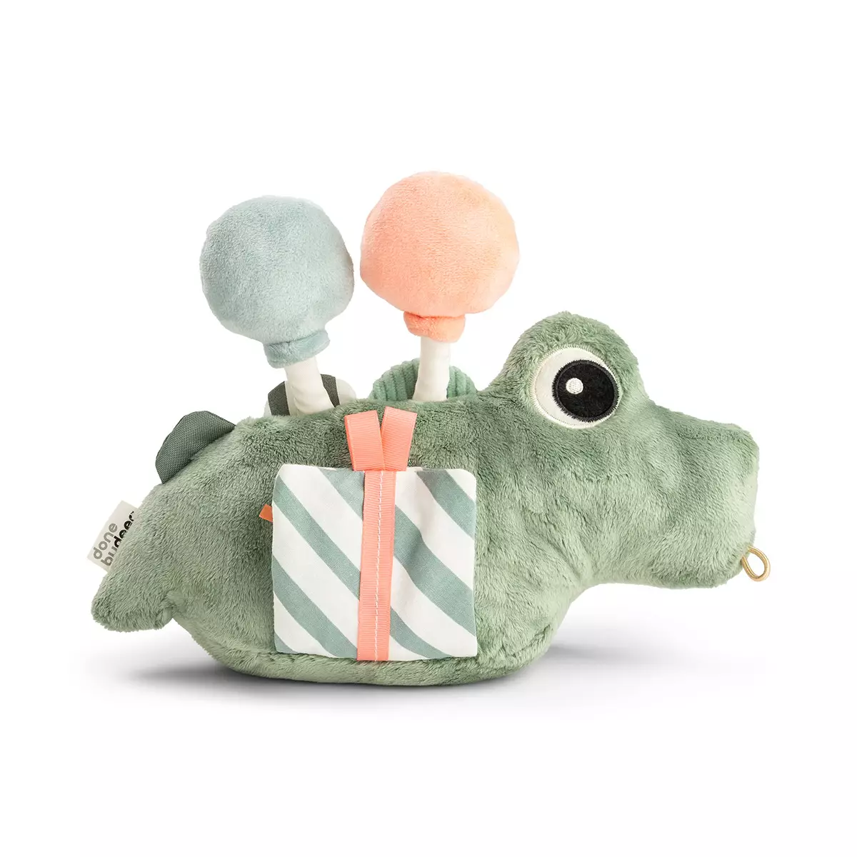 Krokotiili seisoo lattialla tukevasti painavan täytteen ansiosta. Lelussa on myös kiinnityslenkki, jolla kiinnität sen esimerkiksi leikkimaton tai sitterin lelukaareen.