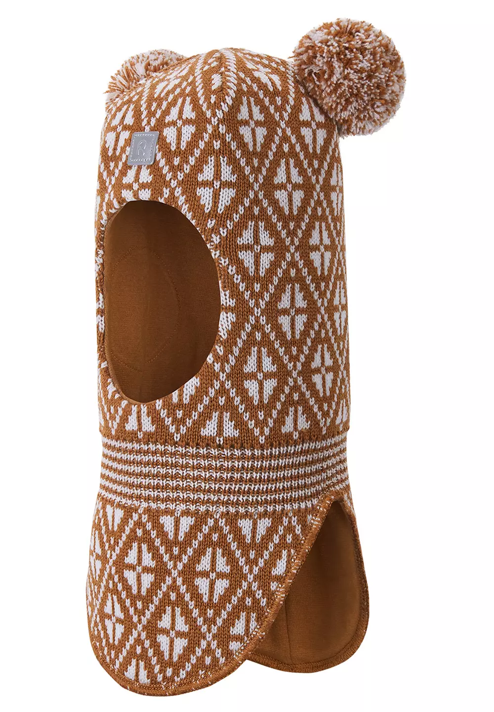 Ruskea-valkoisessa pipossa on kaunis neulospinta sekä kaksi pörröistä tupsua. Edessä on myös heijastava Reima-merkki. Kypärämyssy on kätevä lapsen pukea myös itse!