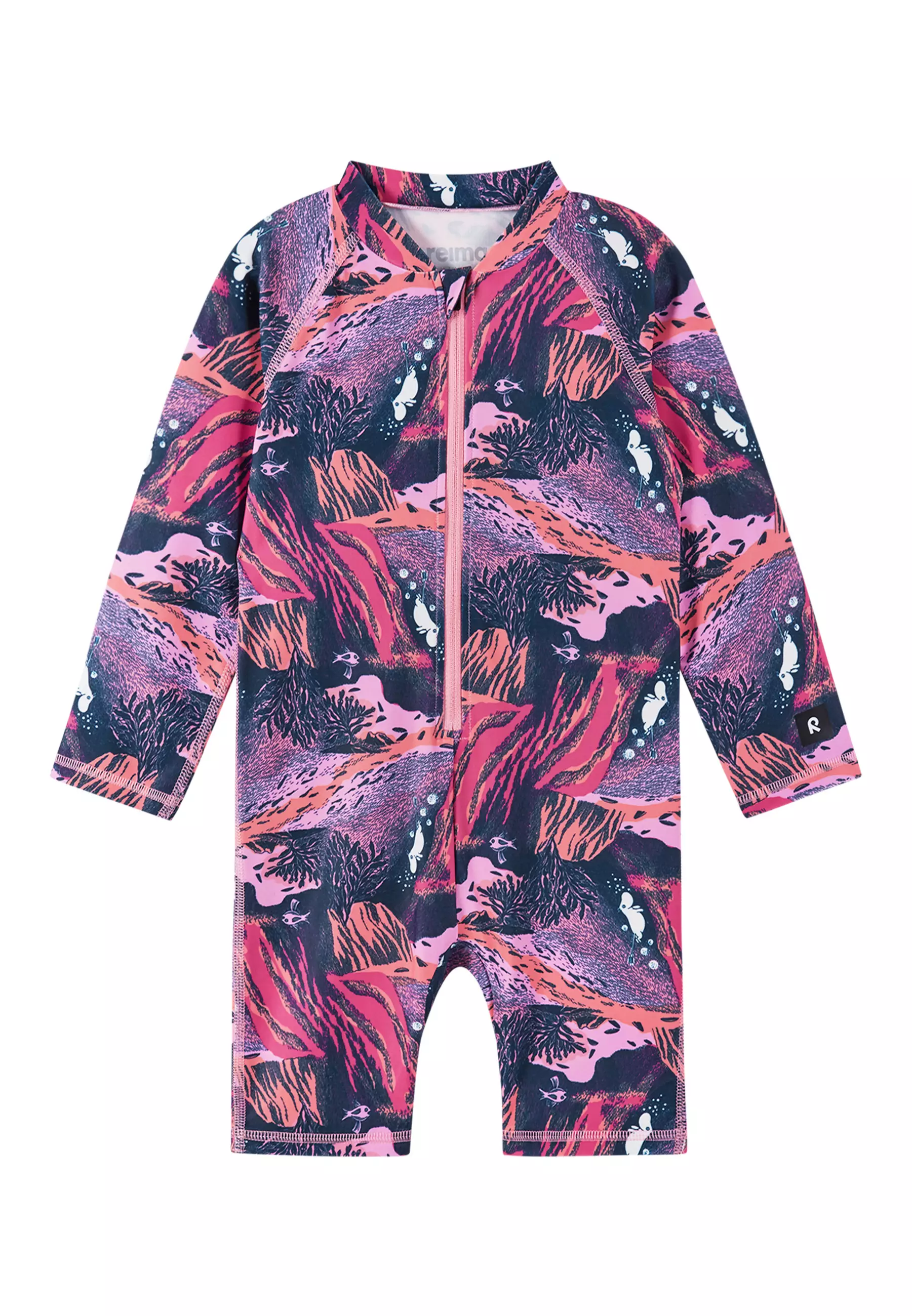 Reima Moomin Sandig UV-uimapuku Rose pink suojaa tehokkaasti auringon haitallisilta UV-säteiltä. Kuvioidussa Muumi-uimahaalarissa on pitkät hihat ja puolipituiset lahkeet ja helppo pukea päälle pitkän vetoketjun ansiosta. Uimapuku on mukavan tuntuista nopeasti kuivuvaa materiaalia. Litteät hankaamattomat saumat tuovat lisämukavuutta. Suojakerroin puvussa on 50+.