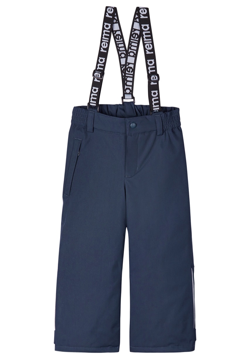 Reimatec Loikka toppahousut Navy ovat erittäin kestävät talvihousut kaikkiin talven lumileikkeihin. Siniset housut mustavalkoisilla henkseleillä.