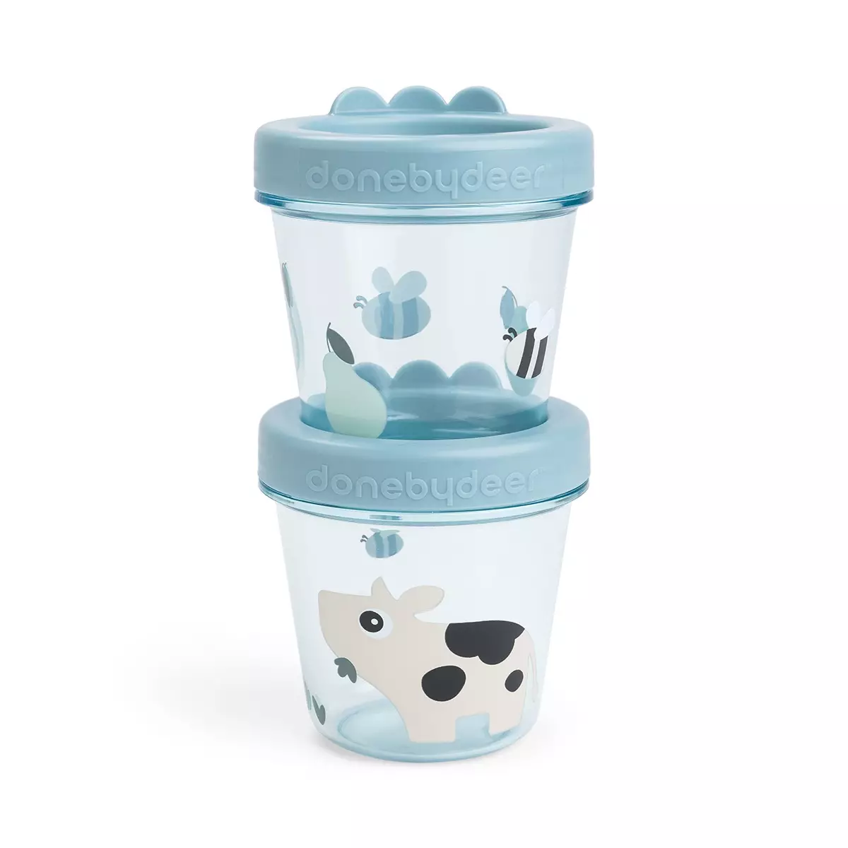 Eväsrasiat Done By Deer Baby Food Container 2-pack Tiny Farm Blue ovat käteviä vauvan ruuan säilytyksessä niin retkillä, kuin arjen menoissakin. Kierrettävä kansi varmistaa että rasiat ovat sekä vuotamattomia, että ilmatiiviitä, joten ne sopivat ihanteellisesti välipalojen ja aterioiden säilytykseen myös tien päällä. Lisäksi niiden pinottava muotoilu mahdollistaa helpon säilytyksen.