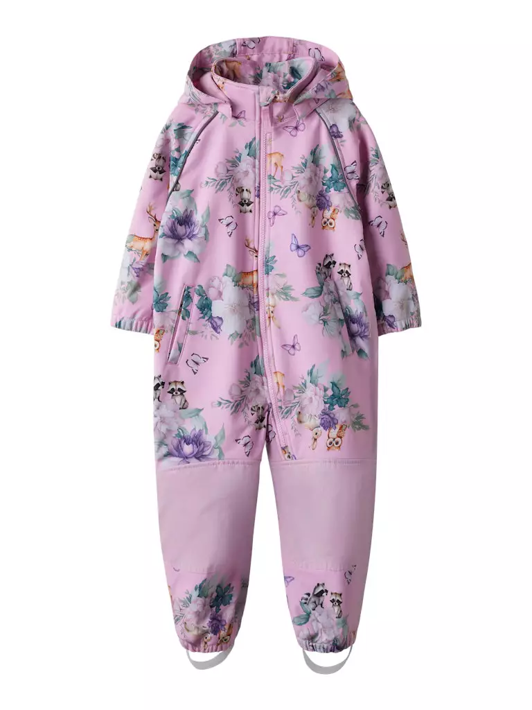 Softshell haalari Name It Alfa Pink Lavender on täydellinen valinta välikauteen, jossa liilalla pohjalla näyttäviä kukkia, joiden seassa suloisia metsän eläimiä. Alfa-haalari on erittäin suosittu valinta päiväkoti-ikäisille.