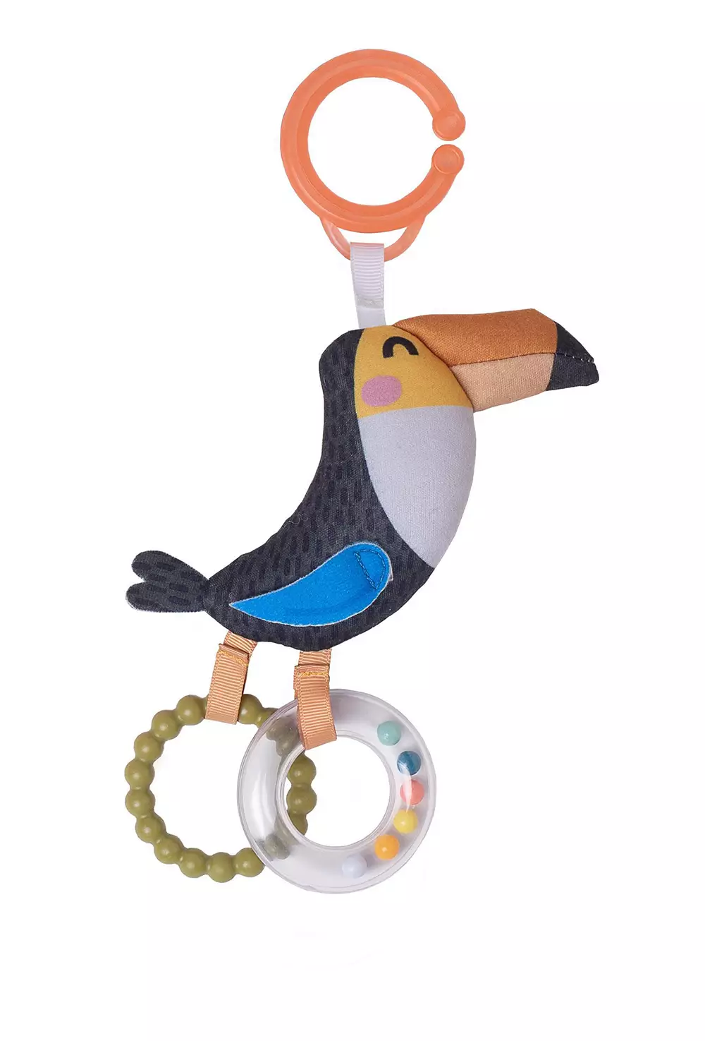 Taf Toys vaunulelu Tuki the Tuccan lapselle. Pehmeä tukaani-lelu helistävällä ja rypistyvällä äänellä sekä purulelurenkaalla. Pehmeässä lintulelussa on värikkäillä helmillä helisevä muovirengas.
