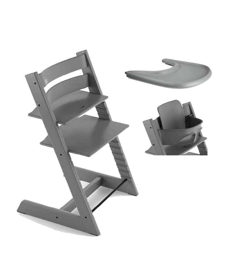 Tripp Trapp starttipaketti Stokke Storm Grey sisältää Stokken Tripp Trapp syöttötuolin, Baby Setin ja tarjottimen, kaikki värissä Storm Grey.