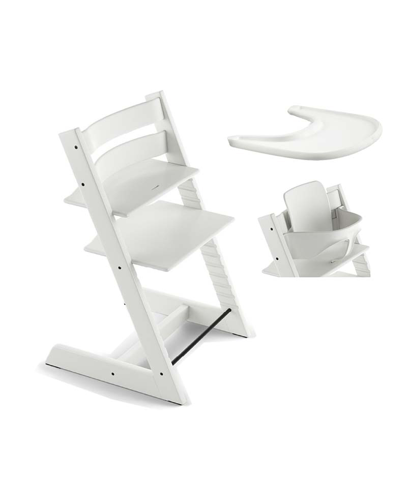 Tripp Trapp starttipaketti Stokke White sisältää Stokken Tripp Trapp syöttötuolin, Baby Setin ja tarjottimen, kaikki värissä White.