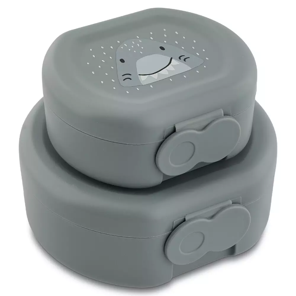 Trixie Eväsrasia 2kpl Mr. Shark on kätevä kahden eväsrasian setti lapselle. Leikkisät harmaat hai-rasiat kahdessa eri koossa. Välipalarasiat on helppo avata ja sulkea näppärän klipsin avulla. Sopivan kokoiset rasiat mukaan retkelle, päiväkotiin, kerhoon ja harrastuksiin välipalalle.