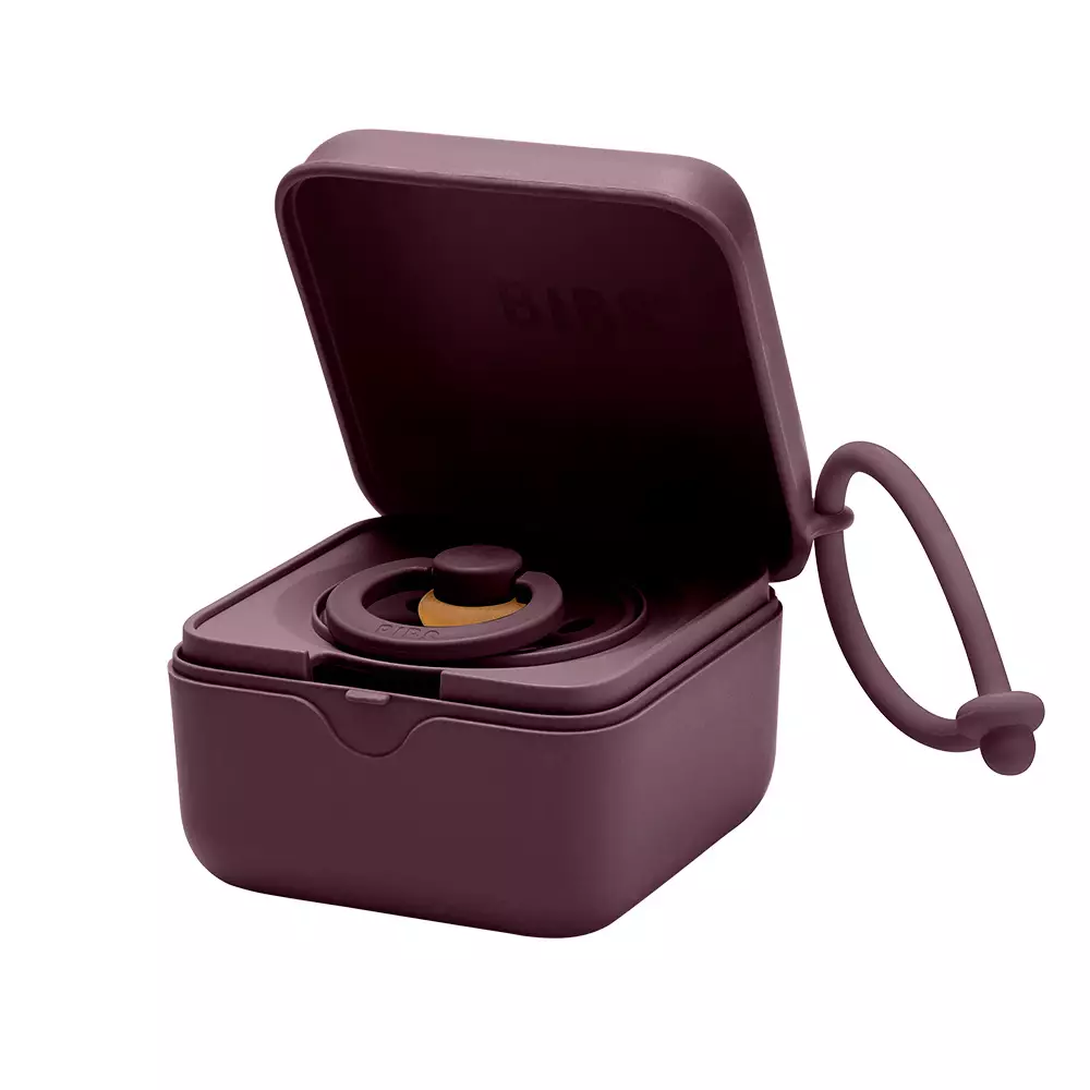 Kätevä Bibs tuttikotelo värissä Plum. Koteloon mahtuu kolme Bibs-tuttia.