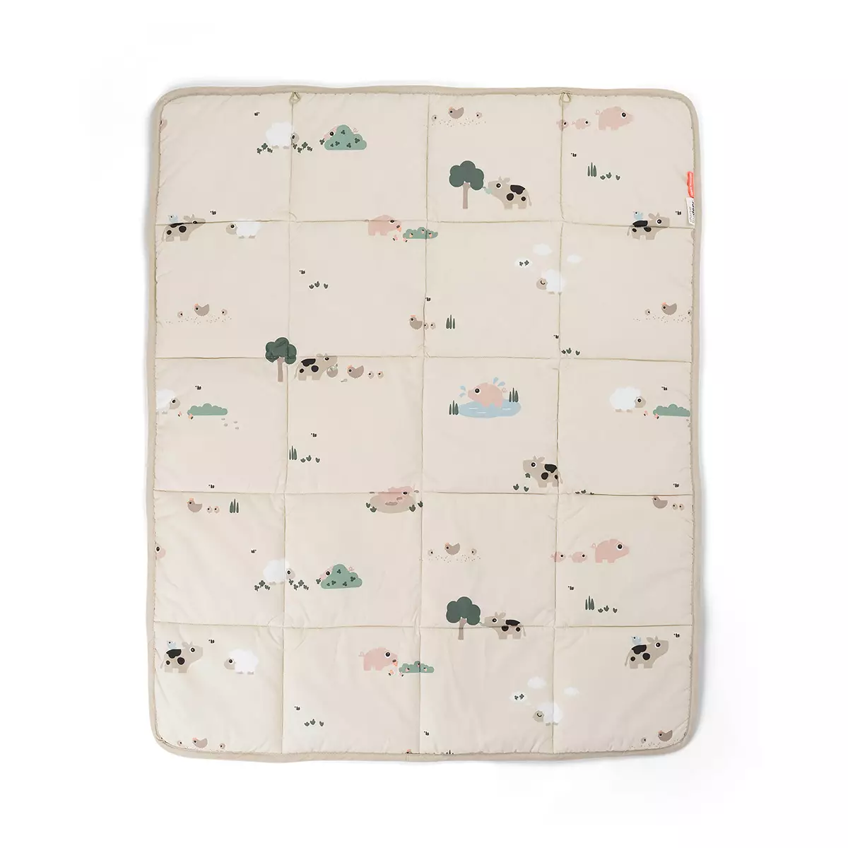 Vauvan leikkimatto Done By Deer Tiny Farm Sand on paksu tikattu leikkimatto. Kauniin hiekan sävyinen leikkimatto on mukava matto jossa lapsesi voi nauttia hauskanpidosta lattialla. Leikkimatossa seikkailevat suloiset maatilan eläinhahmot. Toinen puoli on yksivärinen hiekka.