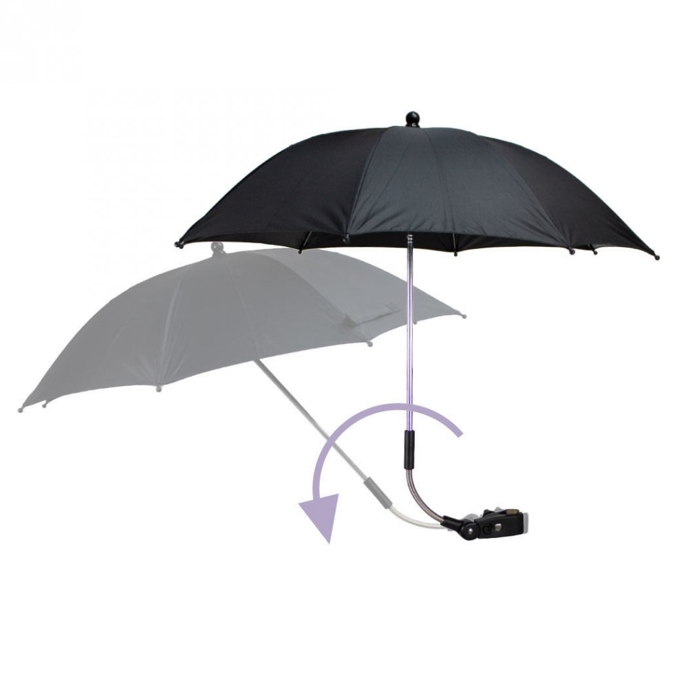 Musta aurinkovarjo kiinnitetään vaunujen tai rattaiden runkoon. Aurinkovarjon saa helposti suunnattua auringon mukaan.