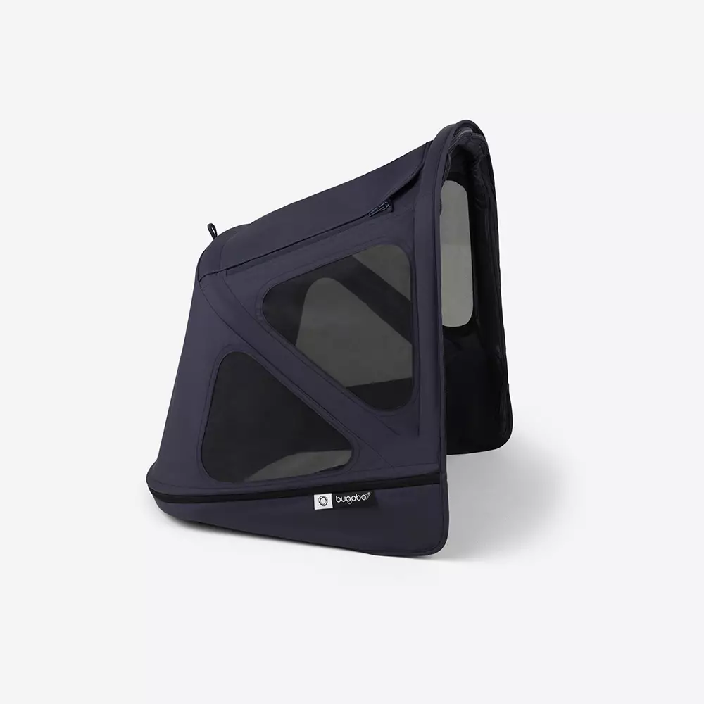 Bugaboo Donkey 5 Breezy sun canopy Deep Indigo on suuri jatkettava kuomu UPF50+ aurinkosuojalla. Kuomu sopii Bugaboo Donkey ja Buffalo -mallistojen yhdistelmävaunuihin eli sekä vaunukoppaan että ratasistuimeen.