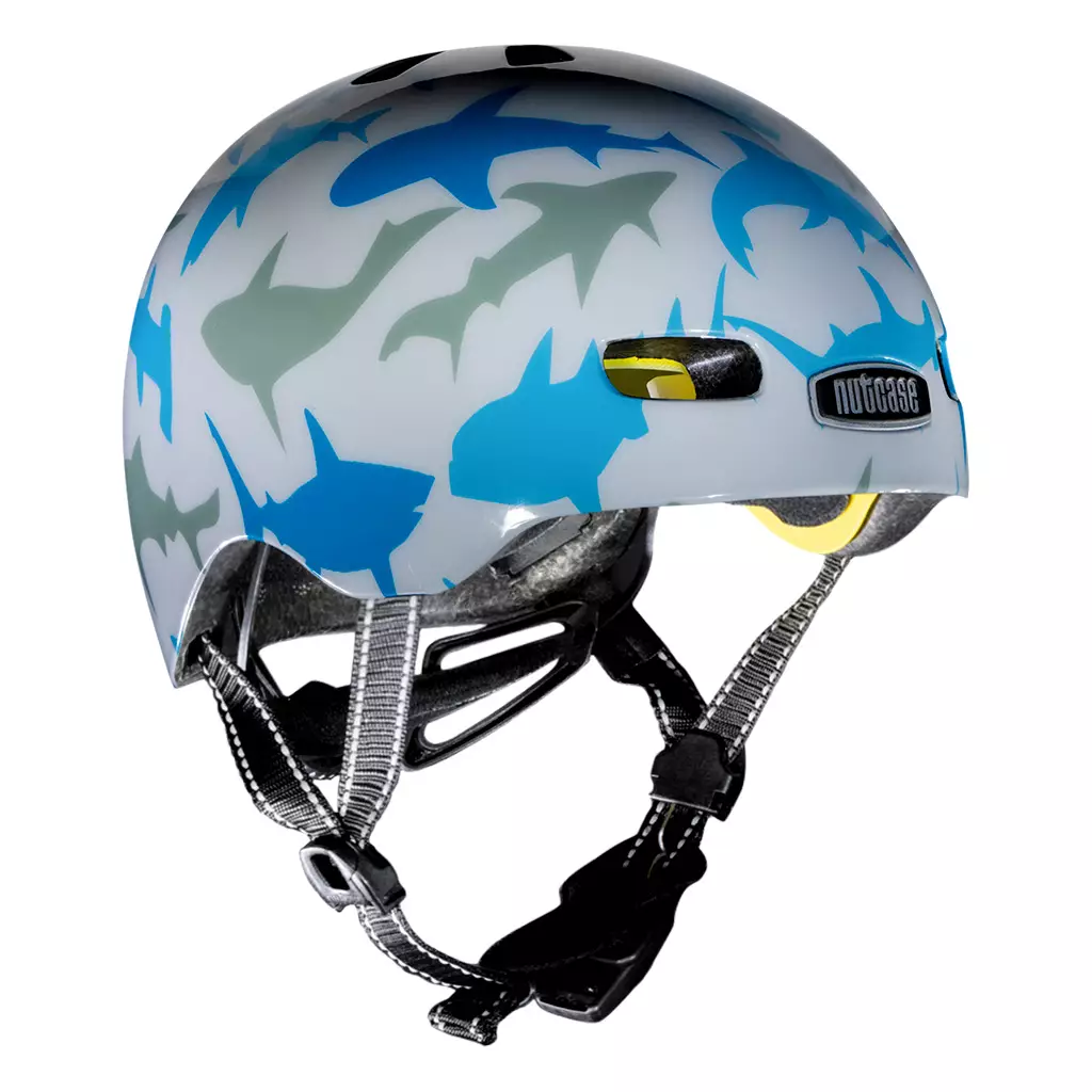 Nutcase Baby Nutty Mips pyöräilykypärä XXS 48-52, Baby Shark Gloss lapsille, jossa valkoisella pohjalla sinisiä haikaloja. Nutcase Baby Nutty kypärä on alan johtava turvallisuuden ja mukavuuden suhteen. Siinä on MIPS turvallisuusjärjestelmä sekä suojaava Crumple Zone EPS-vaahtosisus, joka on suunniteltu erityisesti vauvoille ja joka hajottaa energiaa ja suojaa törmäyksen varalta.