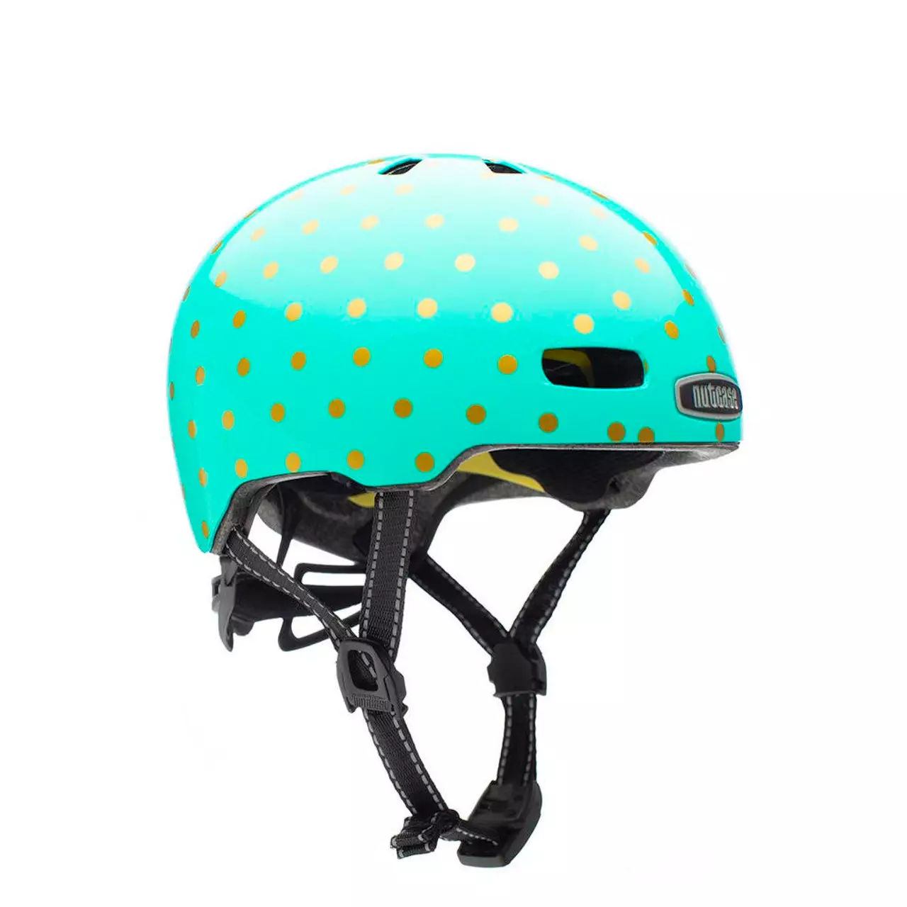 Nutcase Little Nutty Mips pyöräilykypärä XS 48-52, Sock Hop Gloss lapsille, jossa mintun värisellä pohjalla kultaisia palloja. Nutcase asettaa standardin hauskuudelle, kun on kyse lasten kypäristä. Täysin uusi Little Nutty nostaa rimaa jälleen: siinä on mukana MIPS, johtava turvallisuusjärjestelmä sekä suojaava Crumple Zone EPS-vaahtosisus.