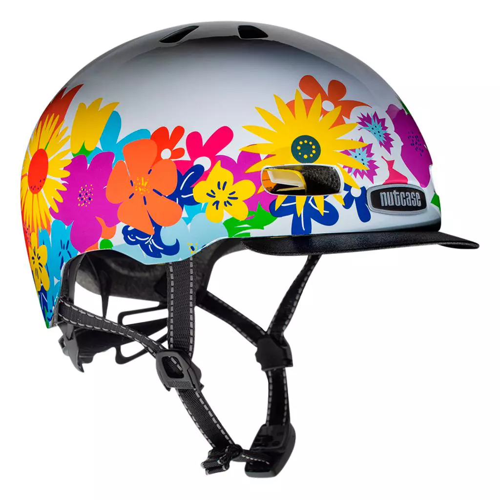 Nutcase Little Nutty Mips pyöräilykypärä XS 48-52, Wild Child lapsille, jossa pirteä kukka-kuosi. Nutcase asettaa standardin hauskuudelle, kun on kyse lasten kypäristä. Täysin uusi Little Nutty nostaa rimaa jälleen: siinä on mukana MIPS, johtava turvallisuusjärjestelmä sekä suojaava Crumple Zone EPS-vaahtosisus.
