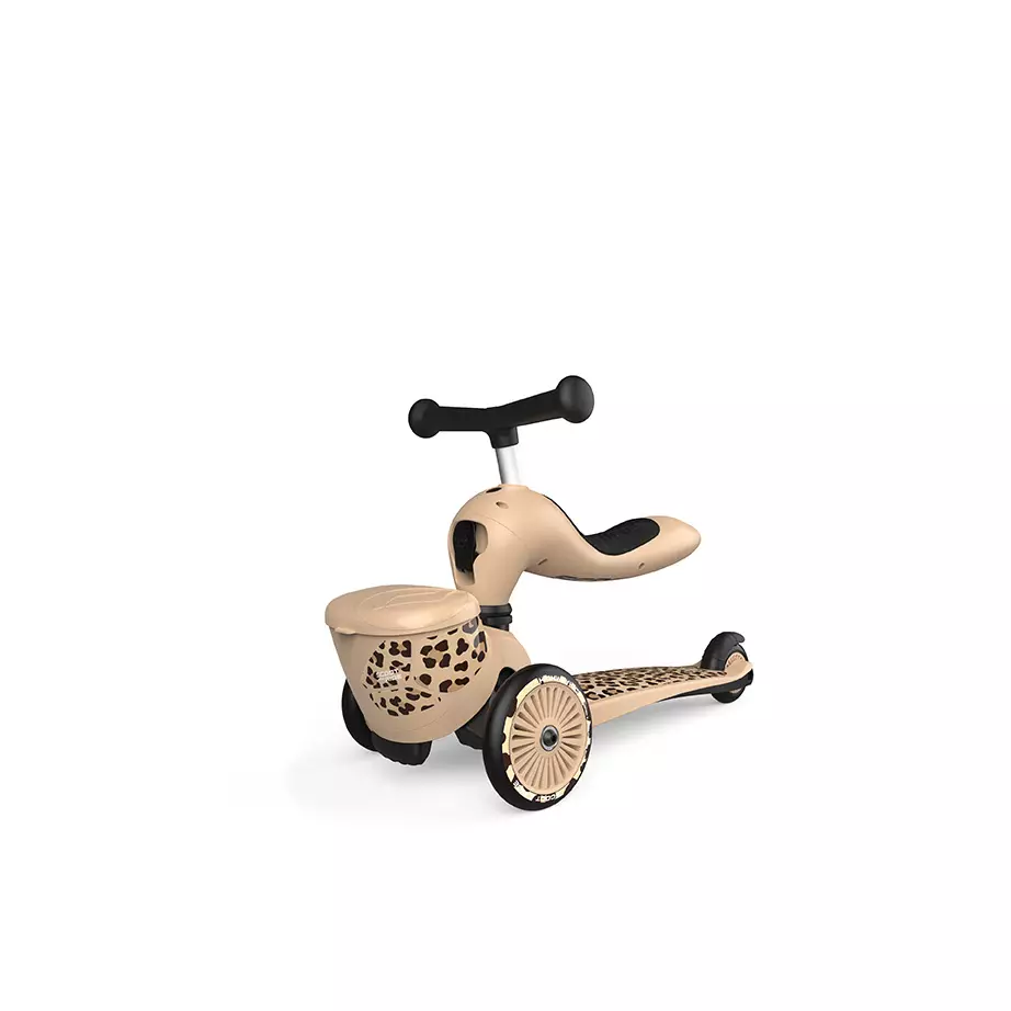 Scoot & Ride potkulauta/potkumopo Highwaykick 1 Lifestyle, Leopard on täydellinen kumppani lapsesi ensimmäisiin seikkailuihin! Tässä mallissa on edessä käytännöllinen säilytyslaatikko, johon lapsi saa mukaansa kaiken tarpeellisen, olipa kyseessä sitten lelut, välipalat tai pienet aarteet. Tämä innovatiivinen 2-in-1 potkulauta muuntuu hetkessä potkupyörästä potkulaudaksi. Ihanteellinen 1-vuotiaasta alkaen noin 5 ikävuoteen saakka!