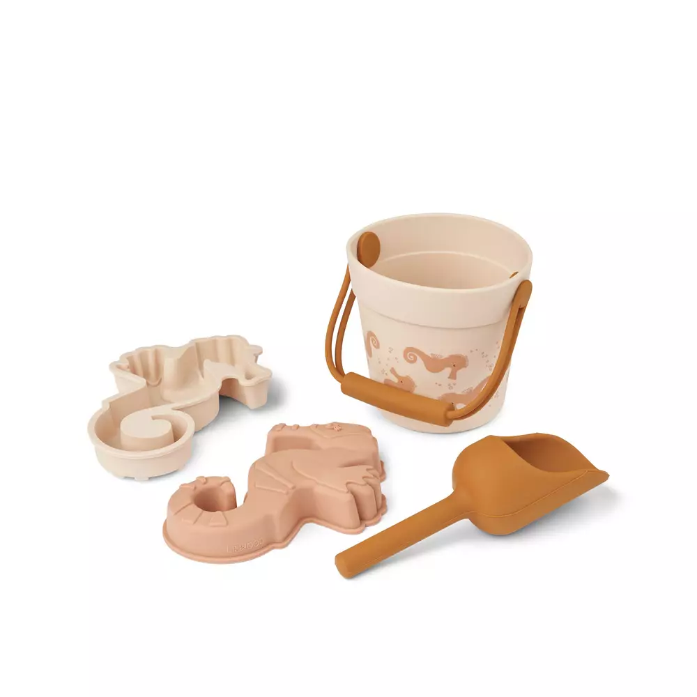 Liewood Kit Mini hiekkalelusetti Seahorse Apple blossom on ihastuttava silikoninen lelusetti pihaleikkeihin. Setti sisältää yhden ämpärin ja lapion, sekä kaksi erilaista muottia, joissa aiheena merihevoset.