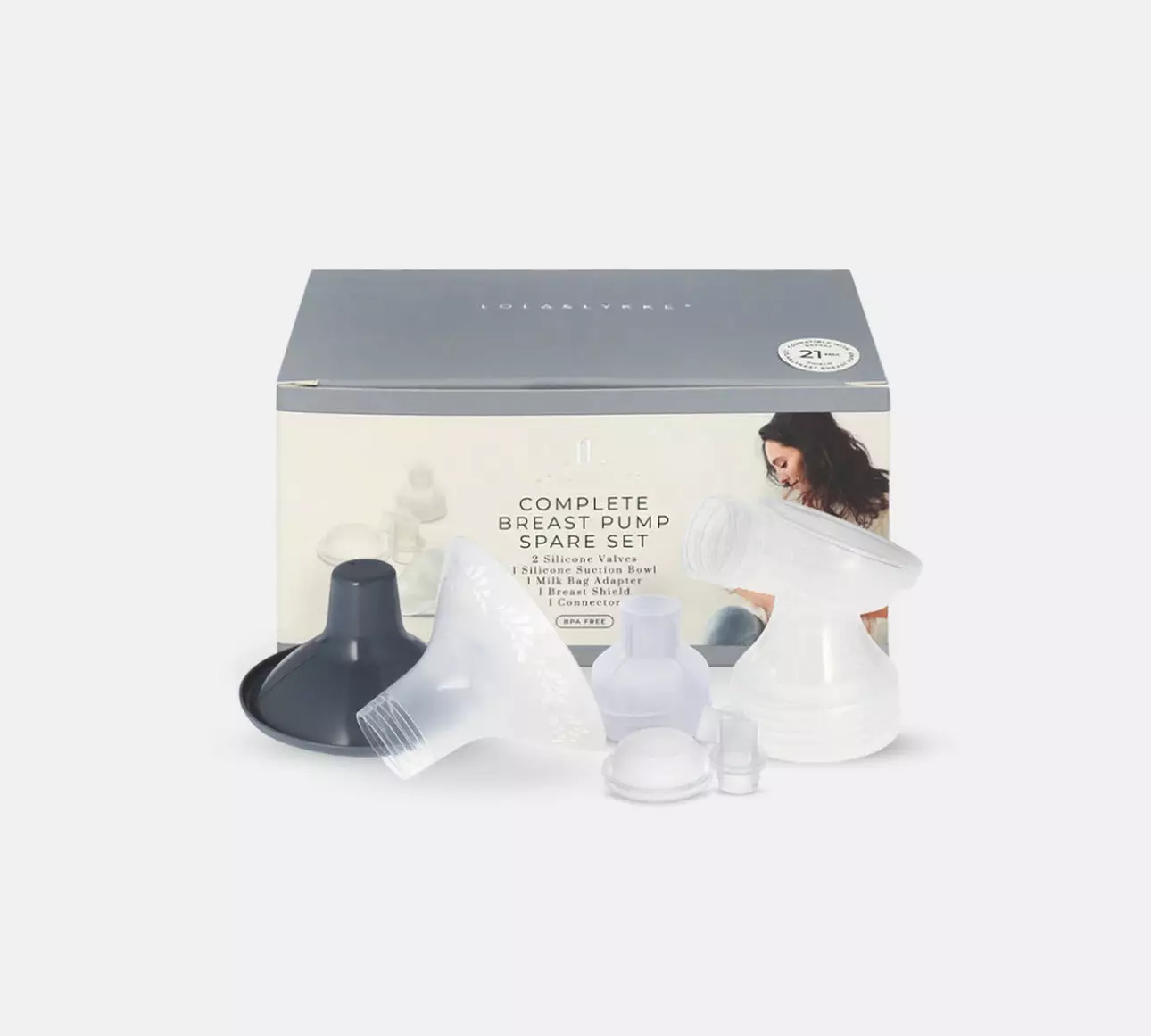 Rintapumppun varaosasetti LOLA & LYKKE 21 mm, on kaiken kattava varaosasetti sähkökäyttöiselle Lola&Lykke rintapumpullesi. Pakkaus sisältää silikoni-imukulhon, kaksi silikoniventtiiliä, maitopussiadapterin, rintasuppilon (21 mm) ja liitinosan.