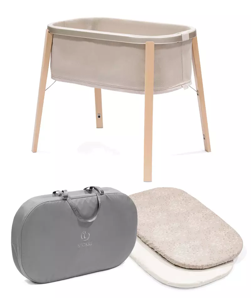 Stokke Snoozi sänky Sandy Beige ja muotolakanat sekä kuljetuslaukku samassa paketissa. Stokke Snoozi sänky on täydellinen pesä pienokaisellesi. Snoozi on uusi versio vauvan kehdosta, joka on ilmava ja kevyt, pehmeä ja soikea muodoltaan. Stokke Snoozi on vauvan ensisänky, joka sopii heti syntymästä alkaen. Siinä on kiinteä mukava patja ja sen hengittävät kankaat tekevät siitä turvallisen paikan vastasyntyneelle nukkua.